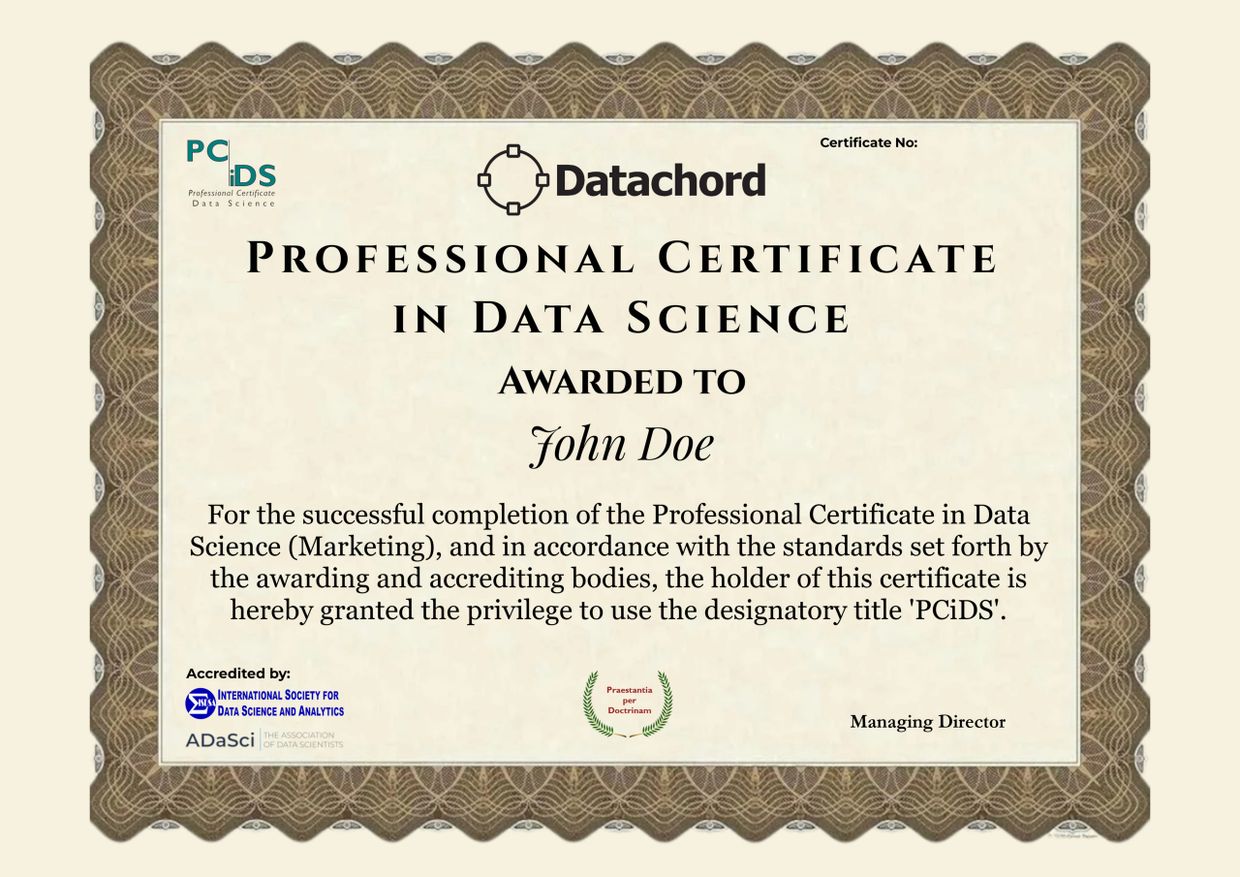 The PCiDS™ certificate issued by Data Chord is accredited by The Association of Data Scientists, the international body for data science and AI.